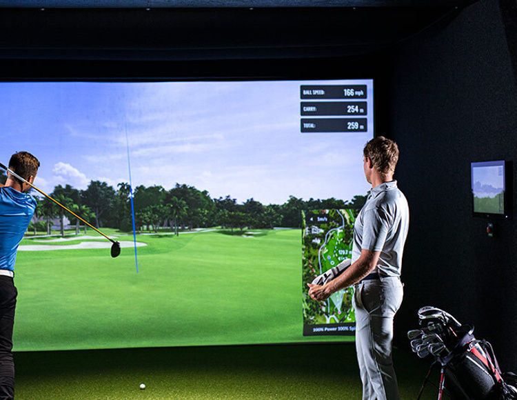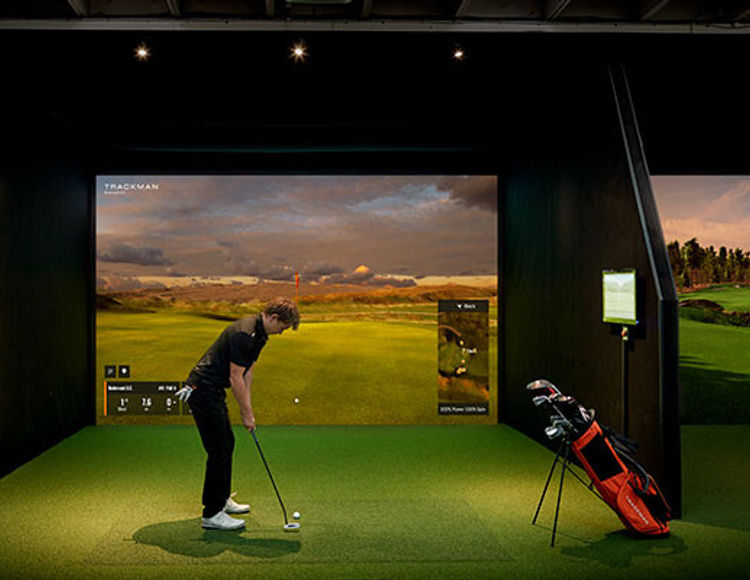 Indoor golf-anläggningen är utrustad med fyra extra stora Trackman 4-simulatorer på konstgräs, vilket skapar en realistisk och högkvalitativ spelupplevelse. Varje bana har en egen sittgrupp med skoställ, bord för mat och dryck samt klubbställ, så att utrustningen alltid är redo för nästa slag.