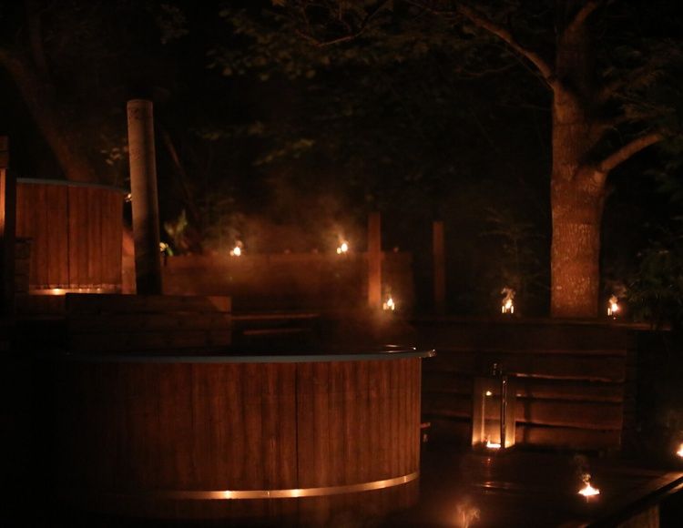 Efter en härlig middag väntar en upplevelse utöver det vanliga. Vägen ner till de vedeldade badtunnorna lyses upp av marschaller och facklor, och ovanför glittrar små lyktor i nattmörkret. Med utsikt över Furusundsleden kan ni sjunka ner i det varma vattnet, koppla av och låta dagens intryck sjunka in.