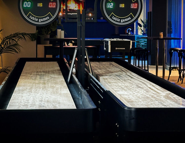 Hos oss spelar du på två shuffleboardbanor i toppklass, precis intill baren. Reglerna är enkla: glid puckarna längst det vaxade bordet, samla poäng – och blocka motståndaren när du kan. Spelet bjuder på både taktik och tur, vilket gör att alla har chans att vinna.